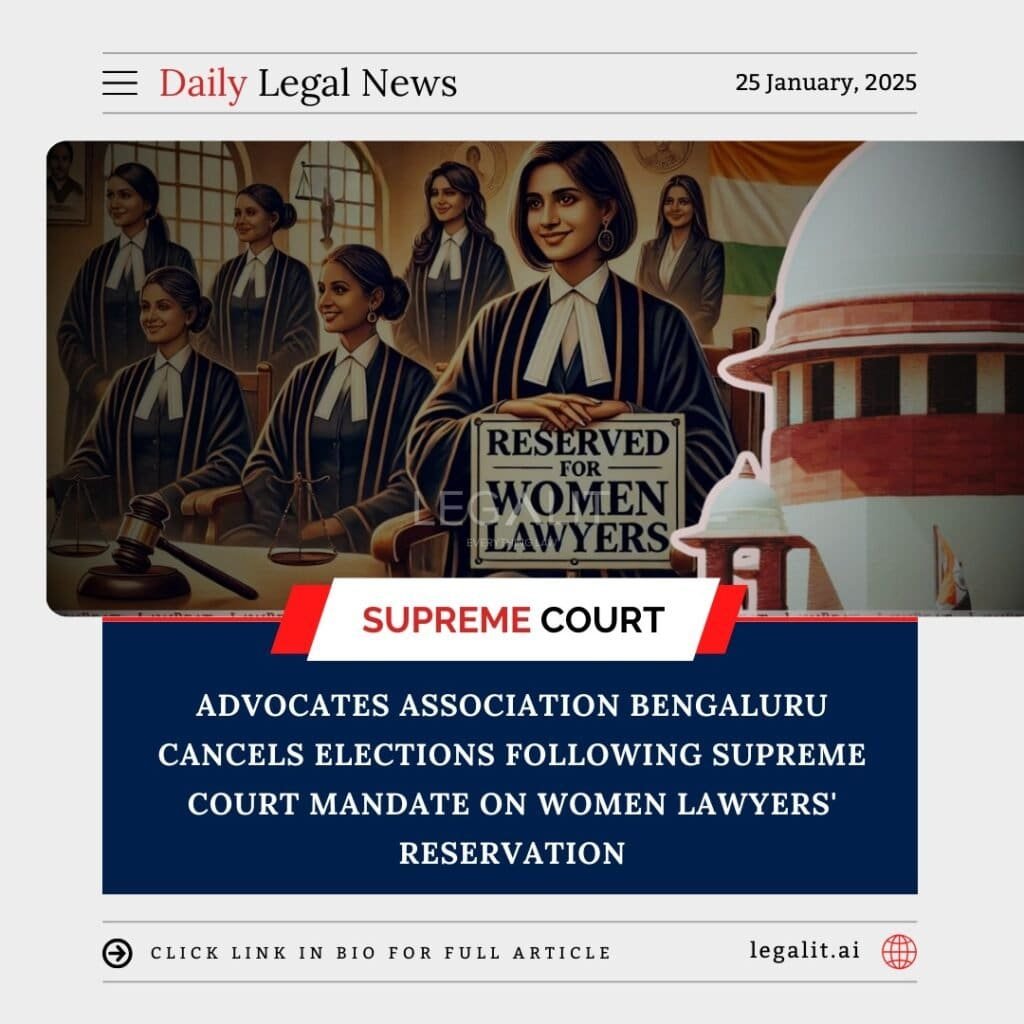 The Advocates Association of Bengaluru (AAB) has canceled its upcoming elections after the Supreme Court directed that 33% of the seats in the association’s governing body be reserved for women lawyers. The decision follows a recent Supreme Court order emphasizing the need for greater representation of women in leadership roles within the legal profession.