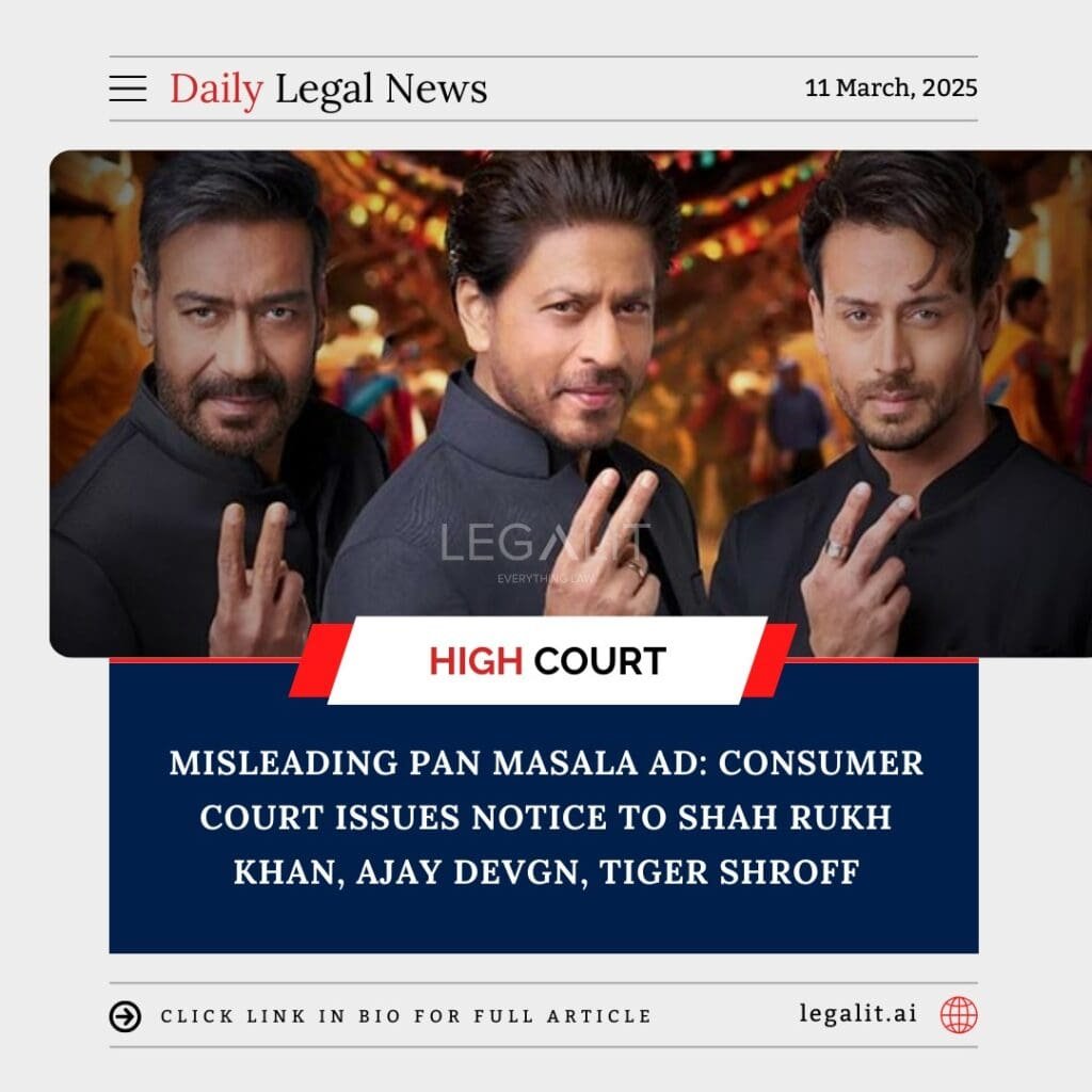 Background A consumer court has issued notices to Bollywood actors Shah Rukh Khan, Ajay Devgn, and Tiger Shroff over their endorsements of a pan masala brand, following allegations that the advertisement misled consumers. The case was filed by a consumer rights activist who argued that such advertisements promote harmful products while misleading the public about
