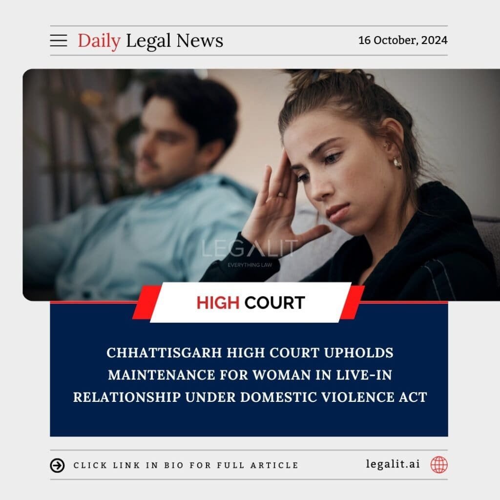 In a significant ruling, the Chhattisgarh High Court has upheld a woman’s right to claim maintenance under the Domestic Violence (DV) Act, even though she was in a live-in relationship. This judgment highlights the evolving interpretation of the law in India, especially regarding non-traditional relationships like live-ins, which are becoming more prevalent in society.