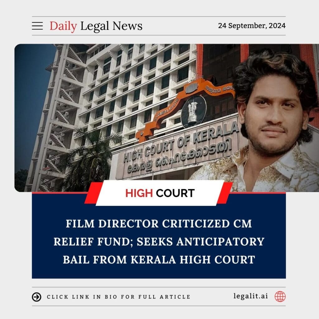 A film director who has been booked for allegedly criticizing the Chief Minister’s Relief Fund has approached the Kerala High Court seeking anticipatory bail. The director, whose comments sparked controversy, now faces charges under sections of the Indian Penal Code (IPC) and other laws, leading to fears of arrest.