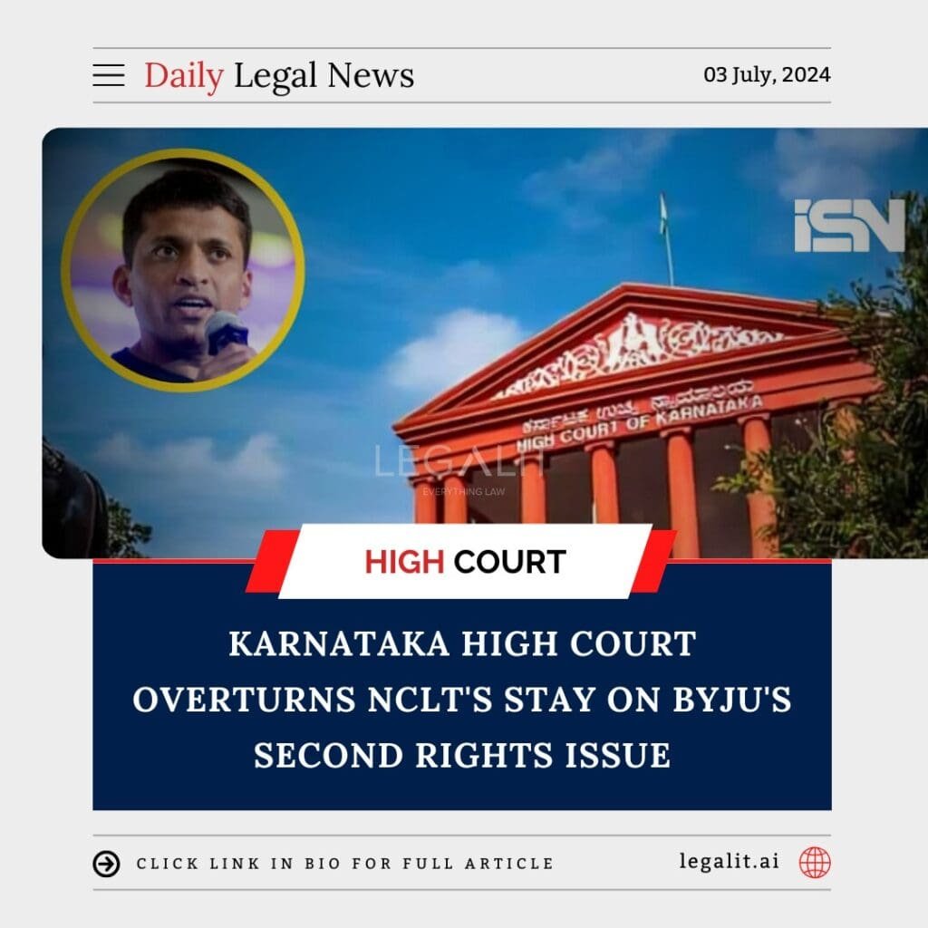 The Karnataka High Court has set aside an order from the National Company Law Tribunal (NCLT) that had previously halted Byju’s second rights issue. This decision is significant for the beleaguered edtech company as it seeks to navigate financial challenges and investor disputes.