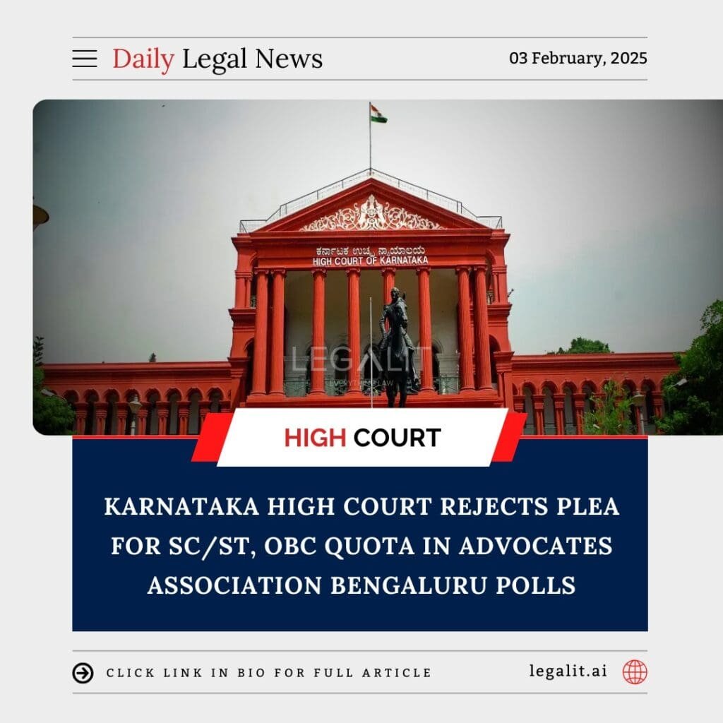 The Karnataka High Court has dismissed a petition seeking the implementation of reservations for Scheduled Castes (SC), Scheduled Tribes (ST), and Other Backward Classes (OBC) in the Advocates Association Bengaluru (AAB) elections. The plea aimed to introduce caste-based reservations in the governing body of the association, arguing that representation from marginalized communities was essential for ensuring diversity and inclusivity in legal institutions.
