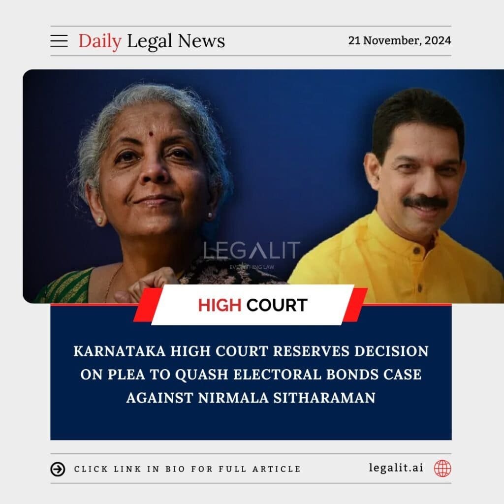The Karnataka High Court has reserved its order on a petition seeking to quash a criminal case against Union Finance Minister Nirmala Sitharaman concerning the controversial Electoral Bonds scheme. The plea challenges the allegations and the maintainability of the case.