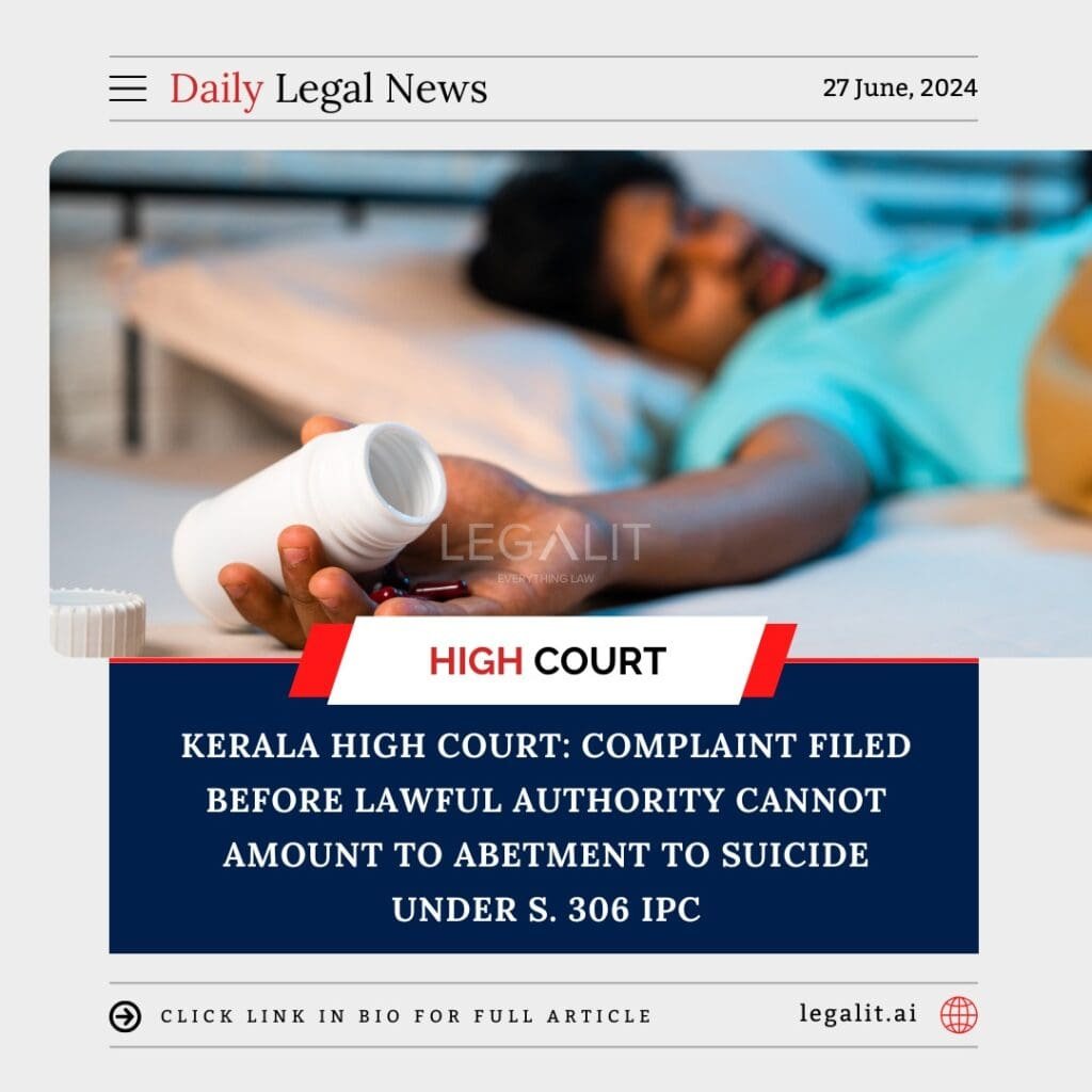 In a significant ruling, the Kerala High Court has held that filing a complaint before a lawful authority cannot be considered as abetment to suicide under Section 306 of the Indian Penal Code (IPC). This decision reinforces the principle that legal actions taken within the framework of the law do not constitute criminal abetment.