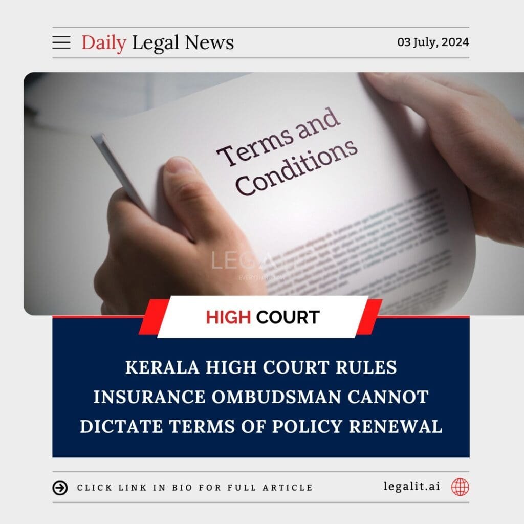 The Kerala High Court has ruled that the Insurance Ombudsman does not have the authority to dictate the terms of insurance policy renewals. This decision reinforces the limitations of the Ombudsman’s role, which is primarily to address grievances related to existing insurance policies and claims.