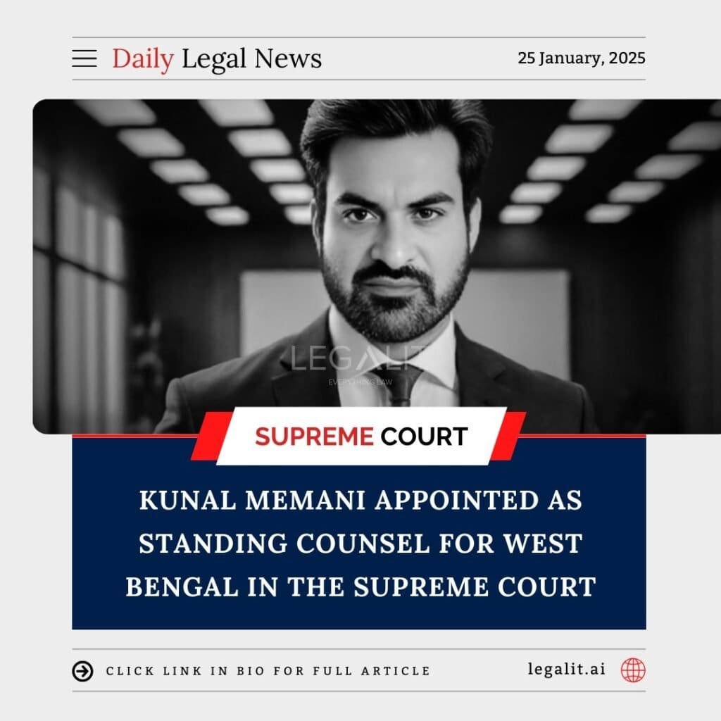 Advocate Kunal Memani has been appointed as the Standing Counsel for the State of West Bengal in the Supreme Court of India. The appointment is a significant step in bolstering the state’s legal representation at the highest judicial forum. Memani’s appointment reflects his professional expertise and the trust placed in him to handle sensitive and high-stakes cases on behalf of West Bengal.