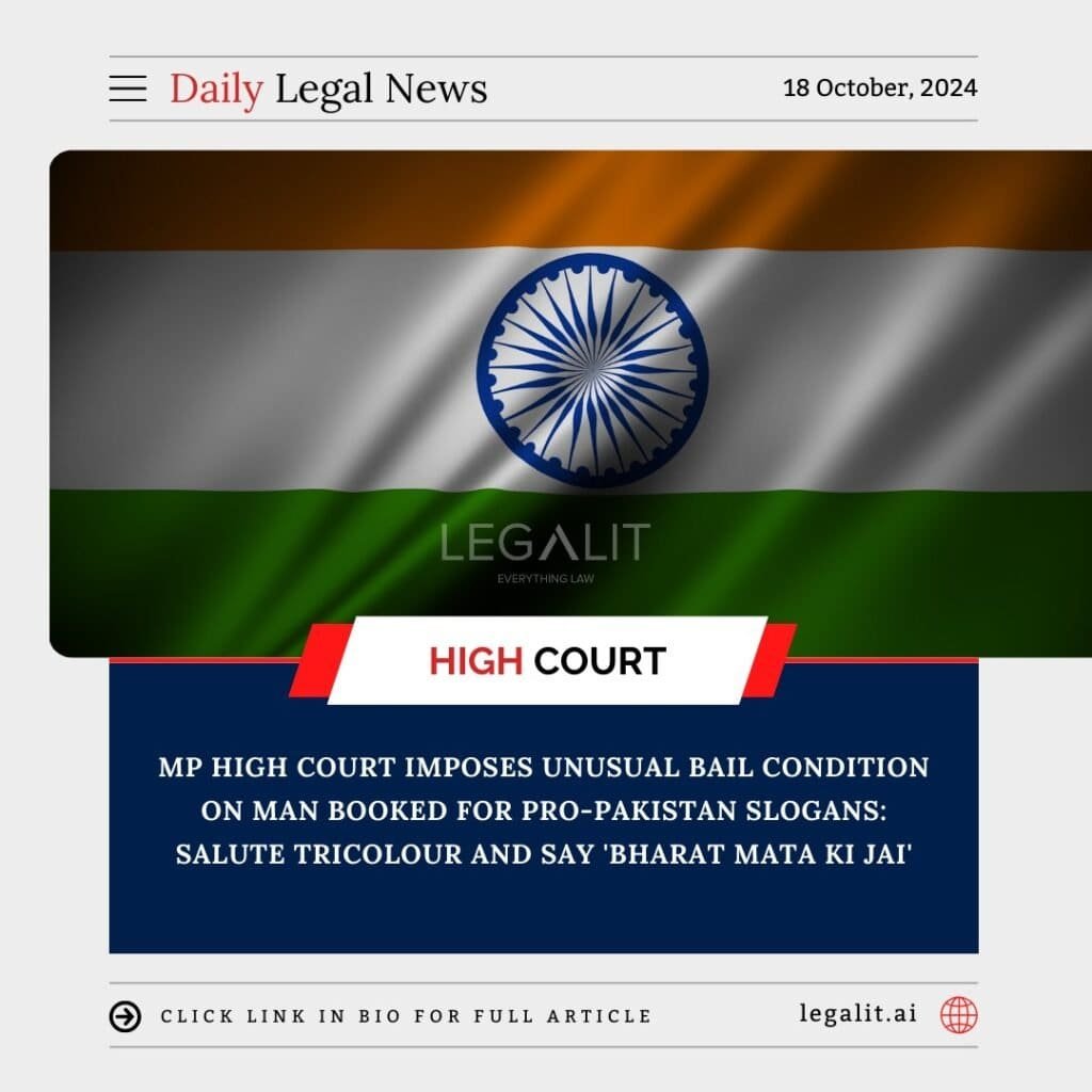 In an unusual move, the Madhya Pradesh High Court granted bail to a man who was booked for allegedly raising pro-Pakistan slogans, with a unique condition attached to his release. The court required the accused to salute the national flag and say “Bharat Mata ki Jai” as part of his bail conditions. This ruling, which comes in response to rising nationalist sentiment, highlights the judiciary’s efforts to instill patriotic values in individuals facing charges of anti-national behavior.