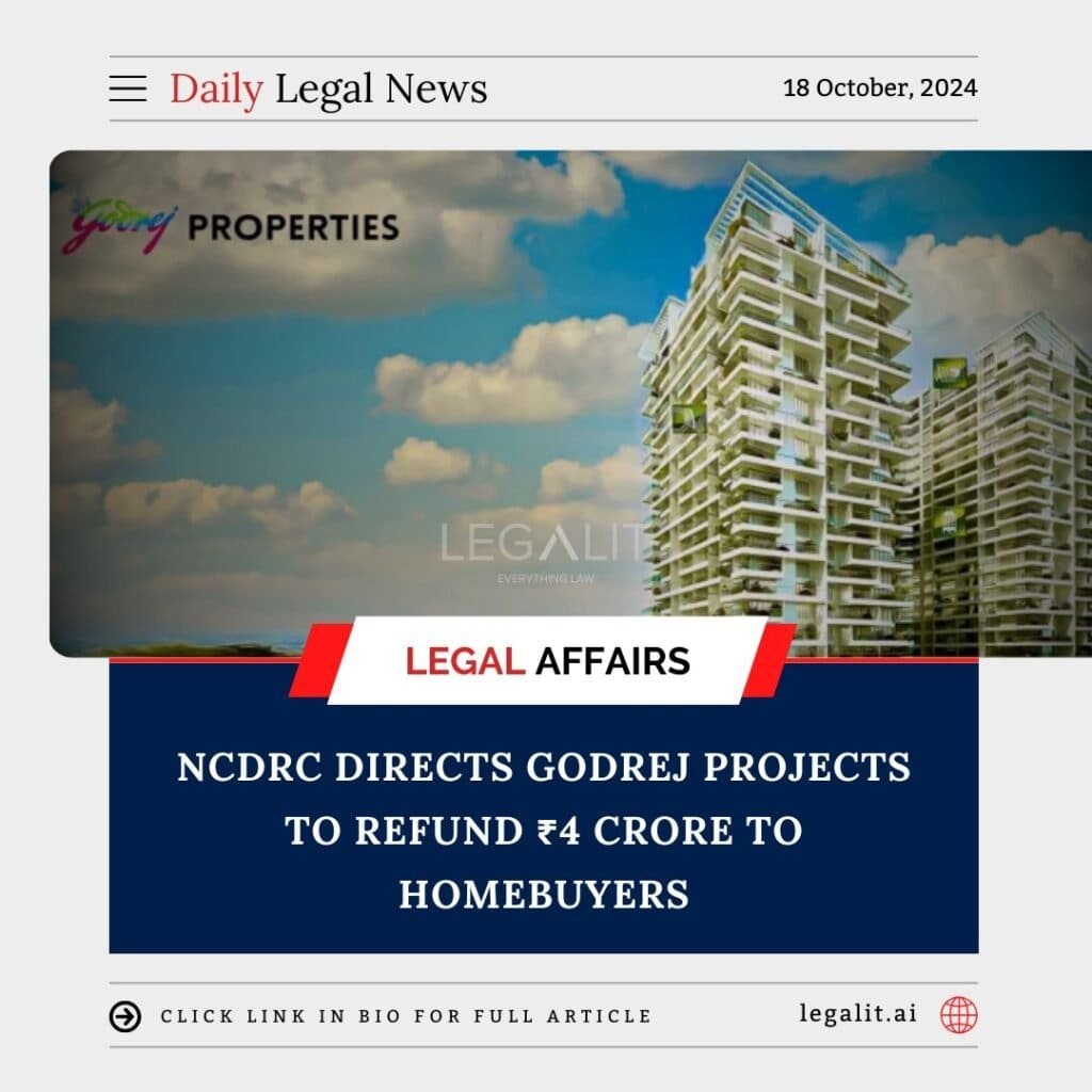 The National Consumer Disputes Redressal Commission (NCDRC) ordered Godrej Projects to refund ₹4 crore to homebuyers due to significant delays in the delivery of residential units. The case involved allegations that the developer had failed to complete the project within the stipulated timeframe, leading to undue hardship for the buyers.