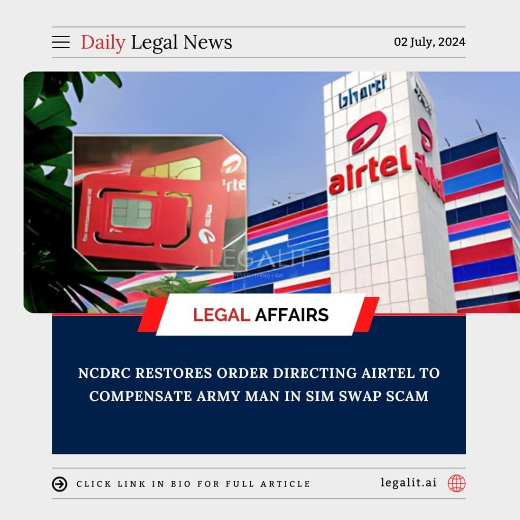 The National Consumer Disputes Redressal Commission (NCDRC) has reinstated an order directing Bharti Airtel to compensate an Army man who lost ₹2.87 lakh due to a SIM swap scam. The case involved a fraudulent issuance of a duplicate SIM card, which led to unauthorized transactions from the victim’s bank account.