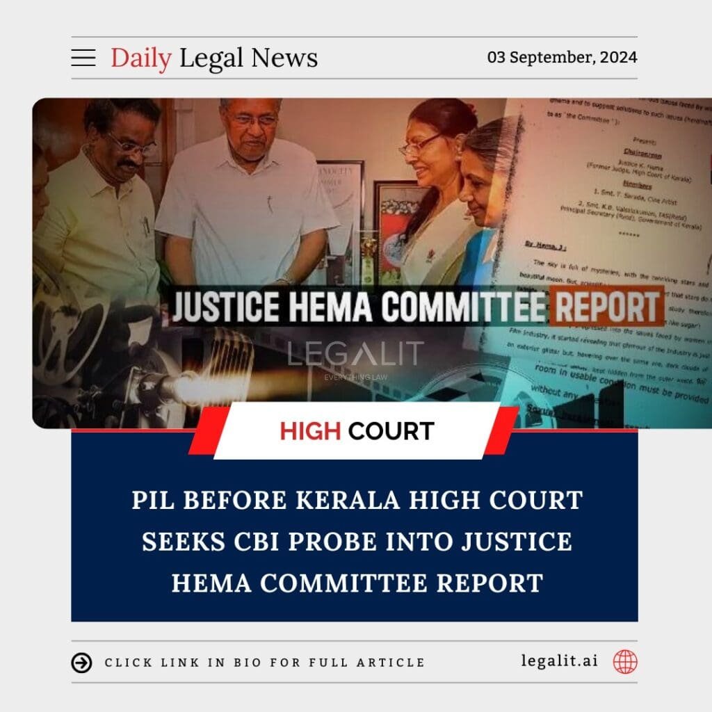A Public Interest Litigation (PIL) has been filed before the Kerala High Court seeking a Central Bureau of Investigation (CBI) probe into the Justice Hema Committee Report. The report, which was submitted to the Kerala government, addresses issues of sexual harassment and exploitation faced by women in the Malayalam film industry. The petitioner argues that a thorough and impartial investigation by the CBI is necessary to bring transparency and accountability to the matter.