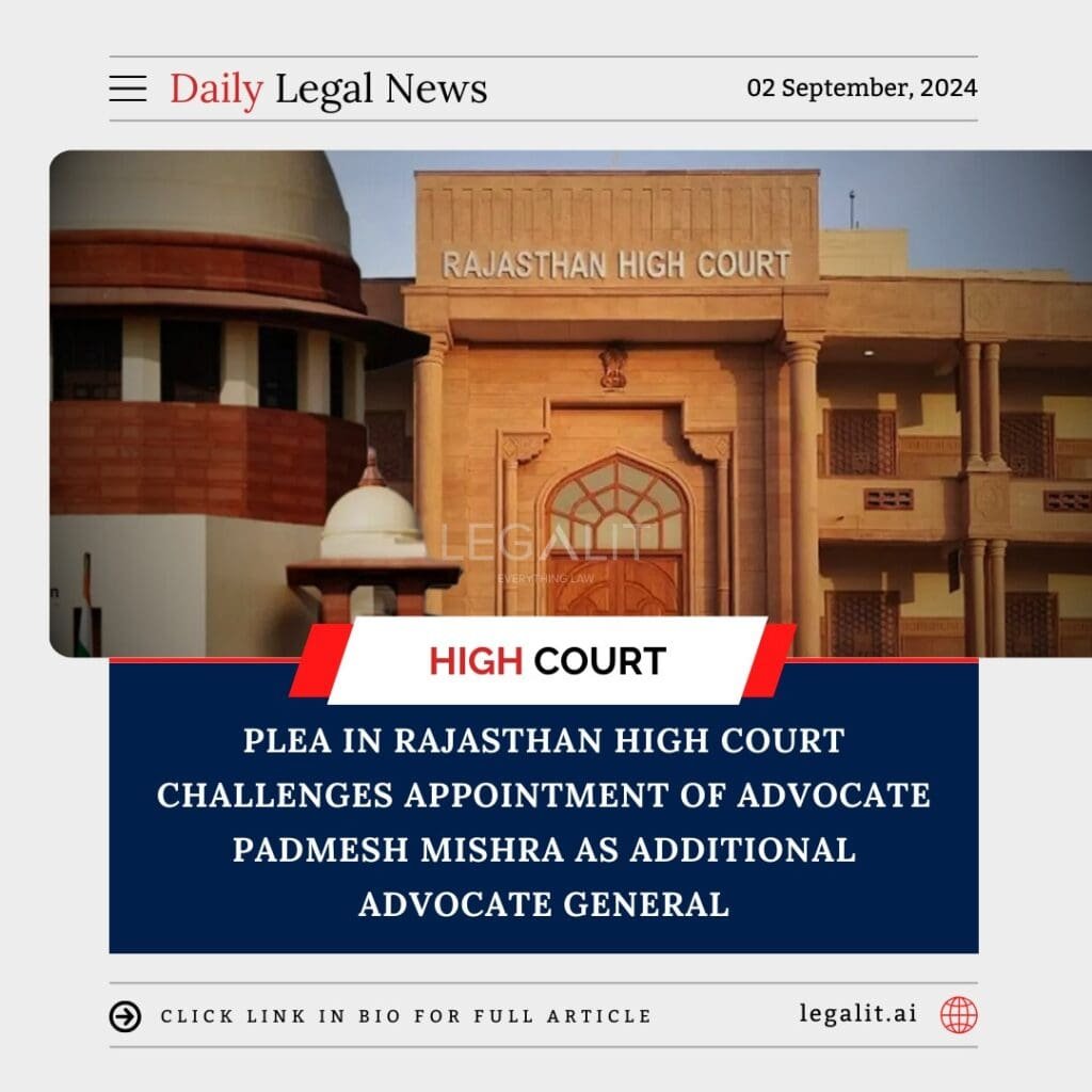 A plea has been filed in the Rajasthan High Court challenging the appointment of Advocate Padmesh Mishra as the Additional Advocate General (AAG) of Rajasthan. The petition raises questions about the legality and propriety of Mishra’s appointment, alleging that it does not adhere to the established norms and criteria for such appointments.