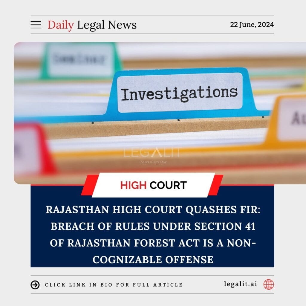 In a significant legal development, the Rajasthan High Court has quashed an FIR related to the breach of rules framed under Section 41 of the Rajasthan Forest Act concerning the transit of forest produce. The court ruled that such breaches are non-cognizable offenses, meaning they do not warrant immediate police action or arrest without a warrant.