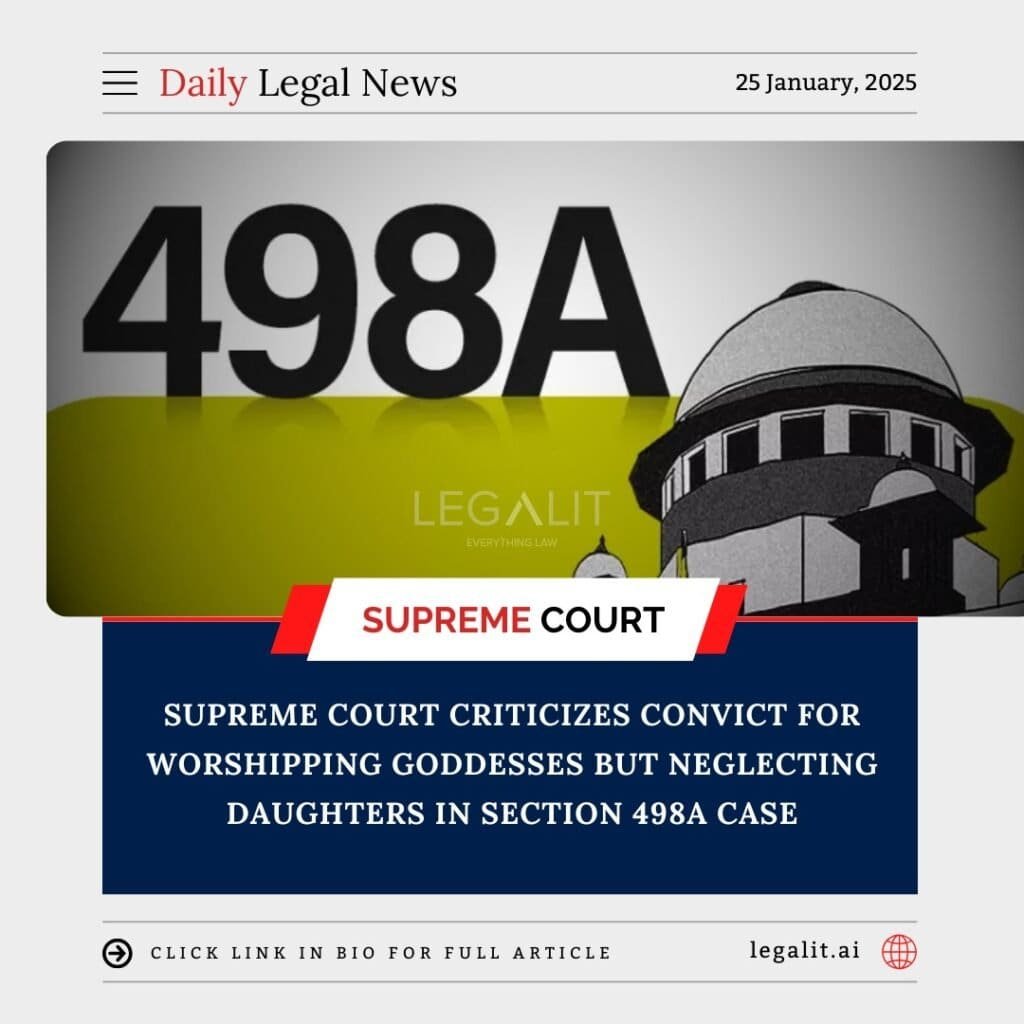 In a sharp reprimand to a man convicted under Section 498A of the Indian Penal Code (cruelty towards a woman by her husband or his relatives), the Supreme Court highlighted the irony of worshipping goddesses like Laxmi and Saraswati while failing to provide for his own daughters. The case involved allegations of domestic cruelty, leading to the man’s conviction under the anti-cruelty provision.