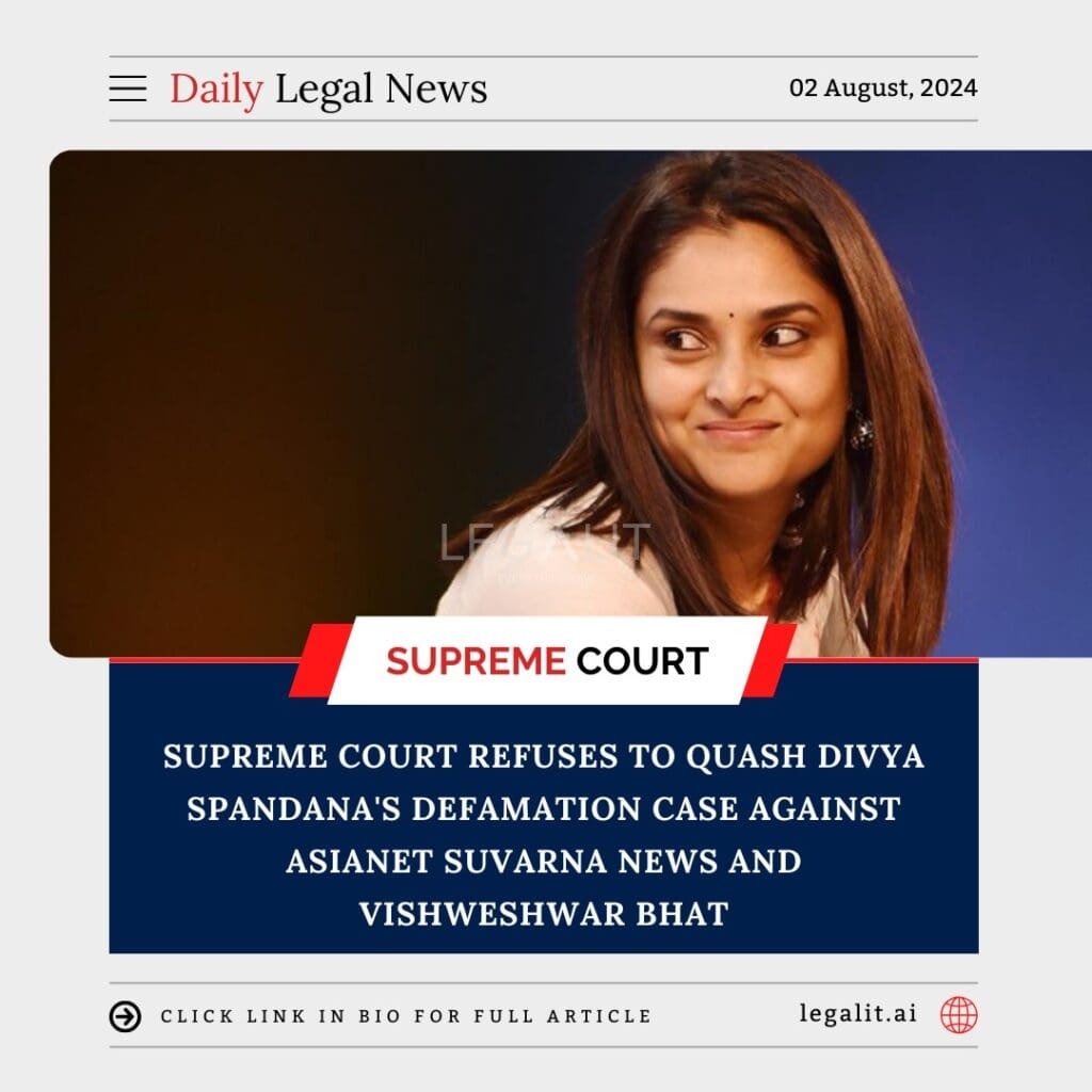 In a significant ruling, the Supreme Court of India has refused to quash the defamation case filed by actress and politician Divya Spandana (also known as Ramya) against the news channel Asianet Suvarna News and its editor Vishweshwar Bhat. This decision underscores the importance of allowing defamation cases to proceed through the judicial process, affirming the rights of individuals to seek redress for alleged reputational harm.