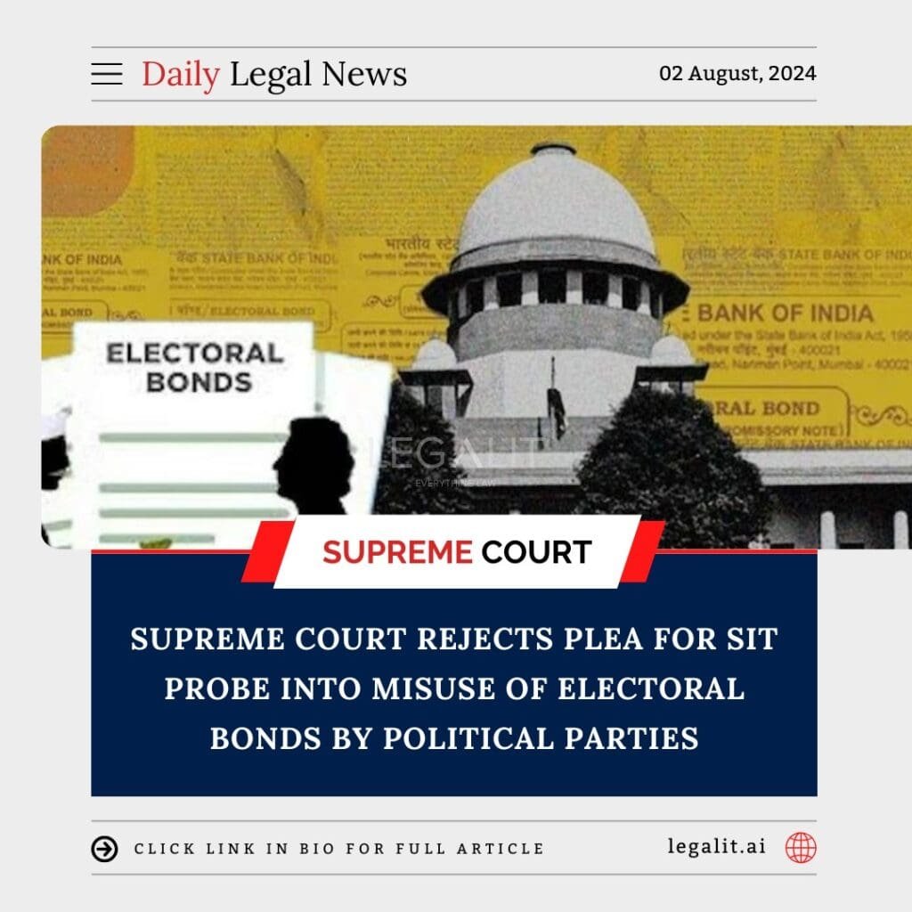 In a significant ruling, the Supreme Court of India has rejected a plea seeking a Special Investigation Team (SIT) probe into the alleged misuse of electoral bonds by political parties. This decision underscores the Court’s stance on the matter while highlighting ongoing concerns regarding transparency and accountability in political funding.
