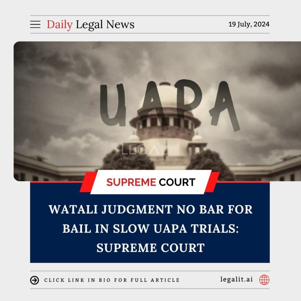 The Supreme Court of India has clarified that the stringent conditions set by the Watali judgment for granting bail under the Unlawful Activities (Prevention) Act (UAPA) do not prevent courts from granting bail if the trial is moving at a snail’s pace. The court emphasized that while the UAPA’s provisions are designed to address serious threats to national security, they should not result in indefinite detention without trial. The judiciary must ensure a balance between national security and the fundamental right to a speedy trial.