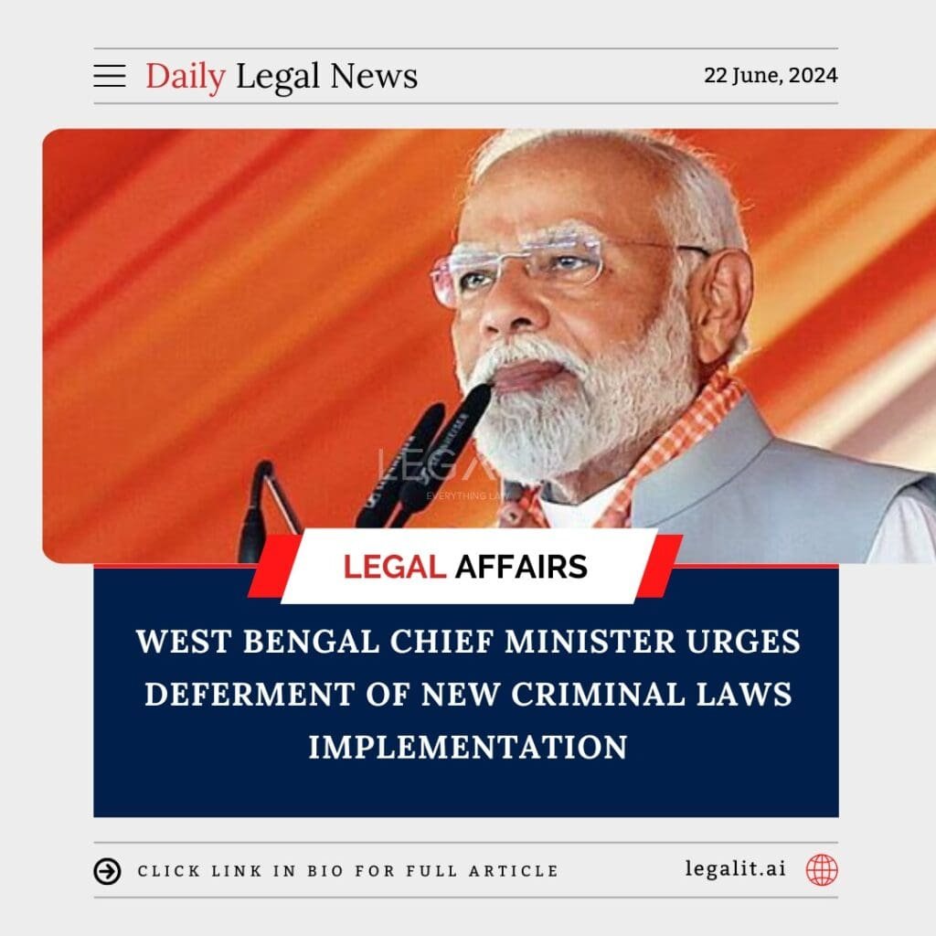 West Bengal Chief Minister Mamata Banerjee has written to Prime Minister Narendra Modi, requesting the deferment of the implementation of three new criminal laws. The laws in question are the Bharatiya Nyaya Sanhita (BNS), Bharatiya Nagarik Suraksha Sanhita (BNSS), and Bharatiya Sakshya Bill, which are set to replace the Indian Penal Code (IPC), Criminal Procedure Code (CrPC), and Indian Evidence Act, respectively.